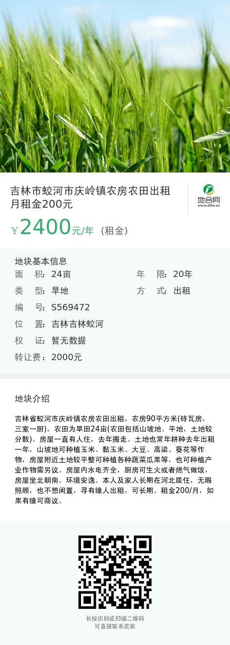 吉林省蛟河市庆岭镇农房农田出租,农房90平方米(砖瓦房,三室一厨),农田为旱田24亩(农田包括山坡地、平地,土地较分散)。房屋一直有人住,去年搬走。土地也常年耕种去年出租一年,山坡地可种植玉米、黏玉米、大豆、高粱、葵花等作物,房屋附近土地较平整可种植各种蔬菜瓜果等,也可种植产业作物需另议。房屋内水电齐全,厨房可生火或者燃气做饭,房屋坐北朝南,环境安逸。本人及家人长期在河北居住,无暇照顾,也不想闲置,寻有缘人出租,可长期。租金200/月,如果有缘可商议。
